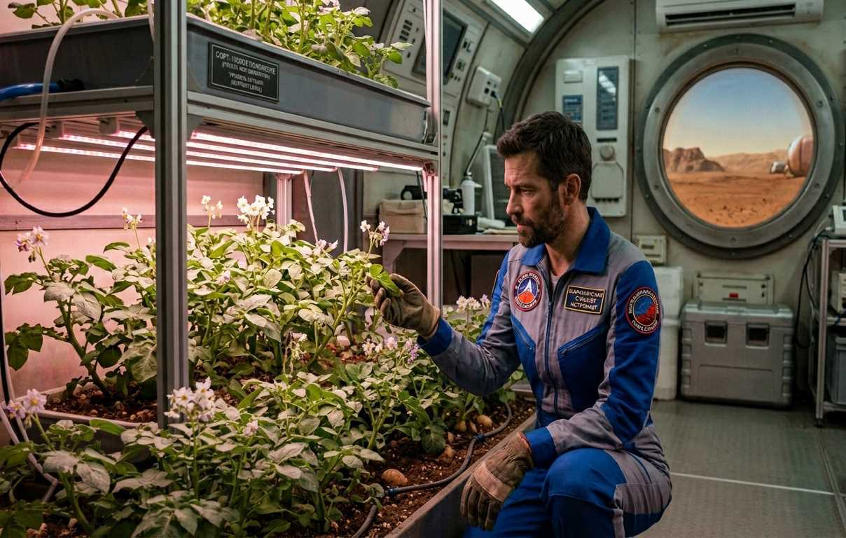 Освещение: марсианский солнечный свет проникал через купол — недостаточно. Дополнительно: внутреннее освещение модуля. Напомним, картофель — культура длинного дня, ему нужно 12–16 часов света в сутки.